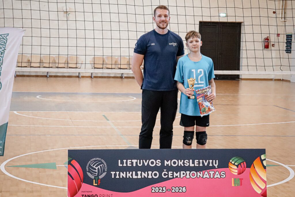 Čempionus ir prizininkus apdovanojo Gargždų „Amber Volley“ tinklinio komandos žaidėjas Vilius Rubavičius, rungtynes stebėjo ir daugiau šios ekipos tinklininkų.